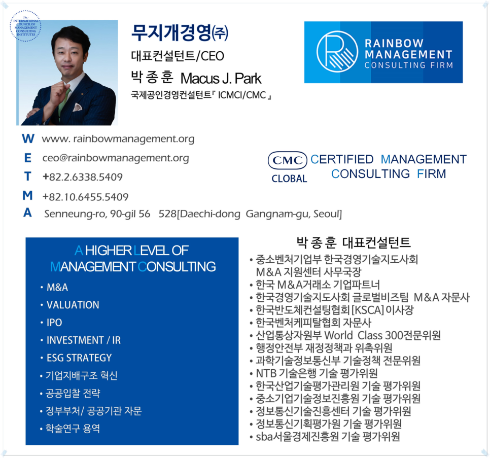 #MnA컨설팅 #기업인수합병 #이해관계조정 #긴급M&A자문 #지배구조개편 #경영권분쟁 #회계사협업 #변호사협업 #경영컨설팅 #무지개경영 #박종훈 #전략컨설팅 #기업위기관리